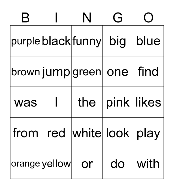 This bingo card has a free space and 24 words: red, yellow, green, orange, blue, purple, brown, black, pink, white, one, was, look, play, jump, do, likes, funny, find, I, with, from, big and or.