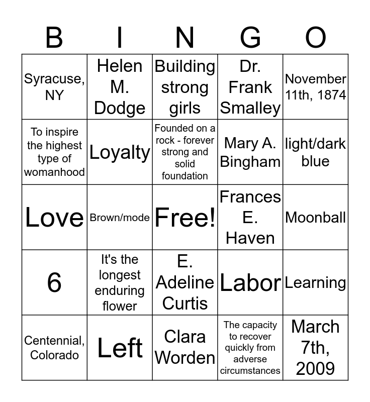 This bingo card has a free space and 24 words: It's the longest enduring flower, Left, Founded on a rock - forever strong and solid foundation, Centennial, Colorado, November 11th, 1874, Syracuse, NY, To inspire the highest type of womanhood, Helen M. Dodge, Frances E. Haven, E. Adeline Curtis, Mary A. Bingham, Love, Labor, Learning, Loyalty, The capacity to recover quickly from adverse circumstances, Moonball, Building strong girls, light/dark blue, Brown/mode, March 7th, 2009, 6, Dr. Frank Smalley and Clara Worden.