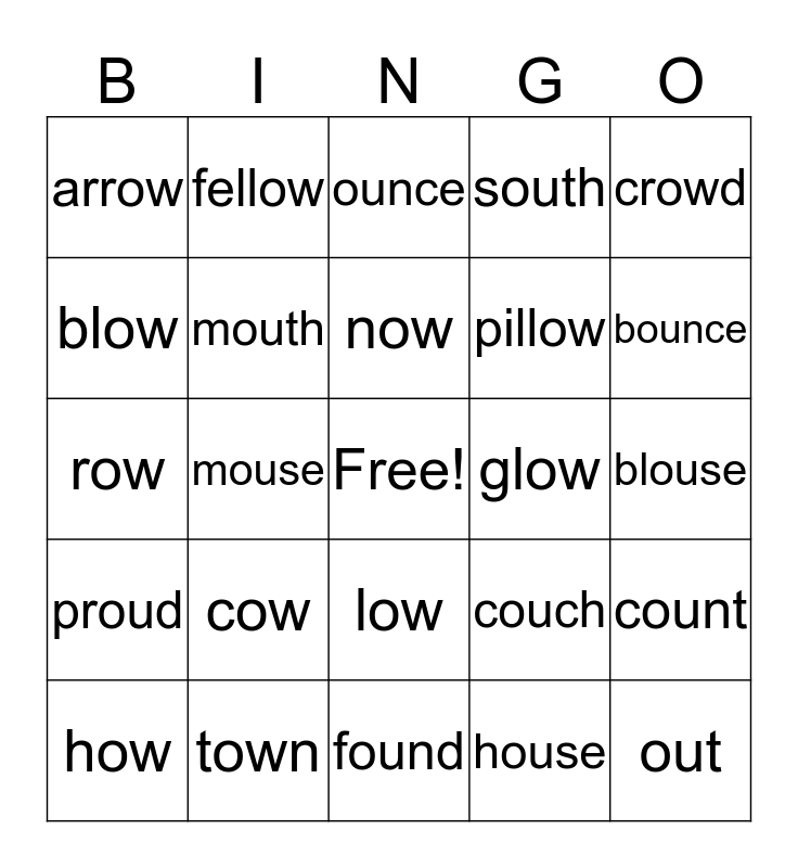 This bingo card has a free space and 24 words: cow, town, now, how, crowd, arrow, blow, fellow, glow, low, pillow, row, couch, count, mouth, house, blouse, ounce, bounce, mouse, out, proud, south and found.