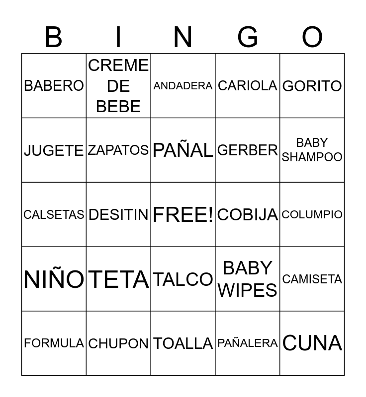 This bingo card has a free space and 24 words: TETA, CHUPON, PAÑAL, FORMULA, GORITO, BABERO, JUGETE, CREME DE BEBE, COBIJA, TALCO, GERBER, CALSETAS, BABY WIPES, CAMISETA, ZAPATOS, PAÑALERA, COLUMPIO, ANDADERA, BABY SHAMPOO, DESITIN, CUNA, NIÑO, CARIOLA and TOALLA.