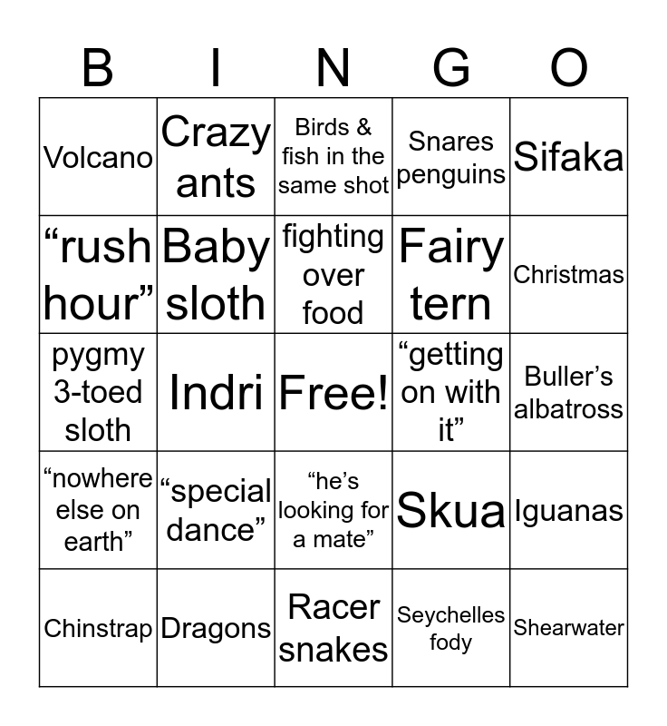 This bingo card has a free space and 41 words: “all life on earth”, pygmy 3-toed sloth, Sexy mating call, Baby sloth, Dragons, “he’s looking for a mate”, fighting over food, Sledgehammer/steak knives, Sifaka, “nowhere else on earth”, Indri, Snares penguins, Shearwater, Buller’s albatross, “getting on with it”, “special dance”, Penguin walks in on albatrosses, Volcano, Timelapse, Birds & fish in the same shot, Iguanas, Mutualism, Racer snakes, Fairy tern, Egg on a stick, Noddies, Seychelles fody, Pisonia, Christmas, “ruled by crabs”, Utopia, Crazy ants, Chinstrap, Falling penguin, Skua, “rush hour”, Aerial tracking shot, Tongue, Audible "aw", #huntingfail and >5000 animals in one shot.