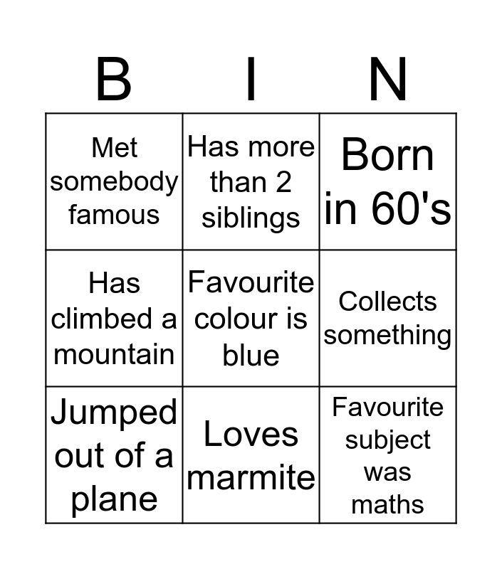 This bingo card has 9 words: Jumped out of a plane, Born in 60's, Has more than 2 siblings, Has climbed a mountain, Met somebody famous, Collects something, Favourite colour is blue, Favourite subject was maths and Loves marmite.