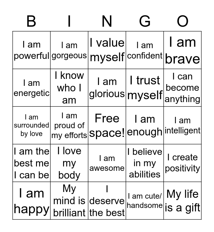 This bingo card has a free space and 39 words: I am worthy of respect, I love myself, I am beautiful, I know who I am, I am happy, I am awesome, I am glorious, I deserve all my dreams, I am brave, I am the best me I can be, I am proud of my efforts, I am confident, My life is a gift, I am intelligent, I am enough, I love my body, I am loved, I am powerful, I believe in myself, I believe in my abilities, I am energetic, I deserve the best, I trust myself, I can become anything, I forgive myself, I am great, I am wonderful, I love face, I am not afraid to stand out, I am gorgeous, I am who I'm meant to be, I am unique, I value myself, My mind is brilliant, I am cute/ handsome, I create happiness, I create positivity, I am surrounded by love and I am perfect.