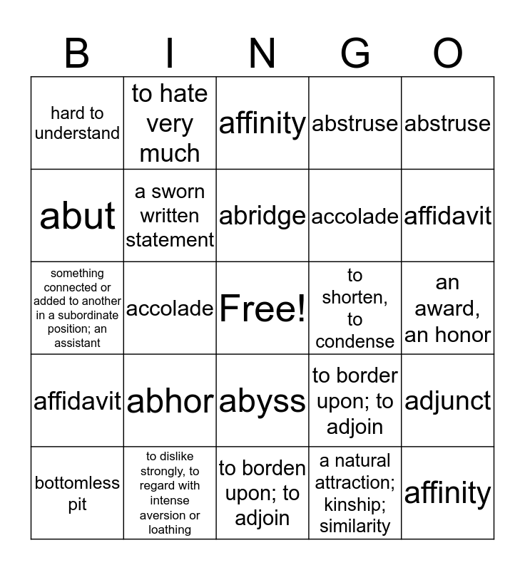 This bingo card has a free space and 24 words: abhor, to dislike strongly, to regard with intense aversion or loathing, abridge, bottomless pit, abstruse, hard to understand, abut, to hate very much, to shorten, to condense, abyss, accolade, something connected or added to another in a subordinate position; an assistant, to border upon; to adjoin, adjunct, a sworn written statement, a natural attraction; kinship; similarity, an award, an honor, affinity, affidavit, accolade, affinity, affidavit, abstruse and to borden upon; to adjoin.
