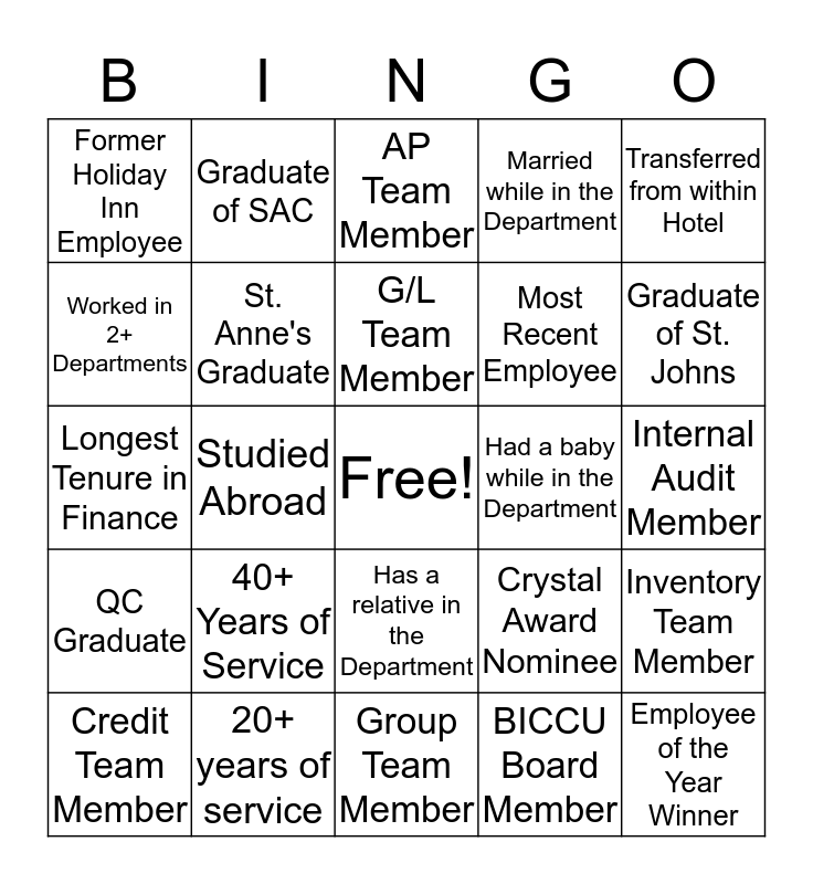 This bingo card has a free space and 24 words: Credit Team Member, 40+ Years of Service, G/L Team Member, BICCU Board Member, Transferred from within Hotel, Former Holiday Inn Employee, Graduate of SAC, AP Team Member, Had a baby while in the Department, Internal Audit Member, Longest Tenure in Finance, St. Anne's Graduate, Crystal Award Nominee, Inventory Team Member, Worked in 2+ Departments, 20+ years of service, Group Team Member, Married while in the Department, Graduate of St. Johns, QC Graduate, Studied Abroad, Has a relative in the Department, Most Recent Employee and Employee of the Year Winner.
