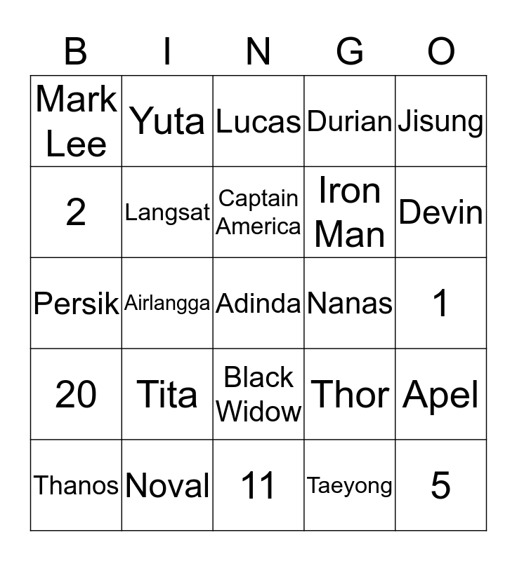 This bingo card has a free space and 24 words: Tita, Noval, Captain America, Thanos, Jisung, Mark Lee, 2, Yuta, Nanas, Black Widow, Iron Man, Persik, Thor, Apel, Langsat, Taeyong, 1, Lucas, Devin, Airlangga, 5, 20, Durian and 11.