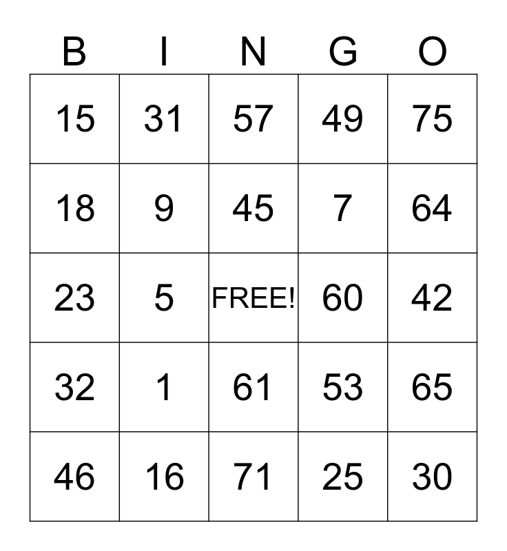 This bingo card has a free space and 24 words: 1, 16, 45, 46, 75, 15, 18, 31, 60, 61, 7, 23, 53, 65, 9, 25, 42, 57, 64, 5, 30, 32, 49 and 71.