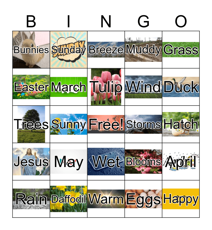 This bingo card has 24 images, a free space and 24 words: May, Daffodil, Tulip, Rain, Grass, Bunnies, Easter, Sunday, Storms, Wet, Wind, Trees, Blooms, April, March, Eggs, Hatch, Breeze, Duck, Sunny, Happy, Jesus, Muddy and Warm.