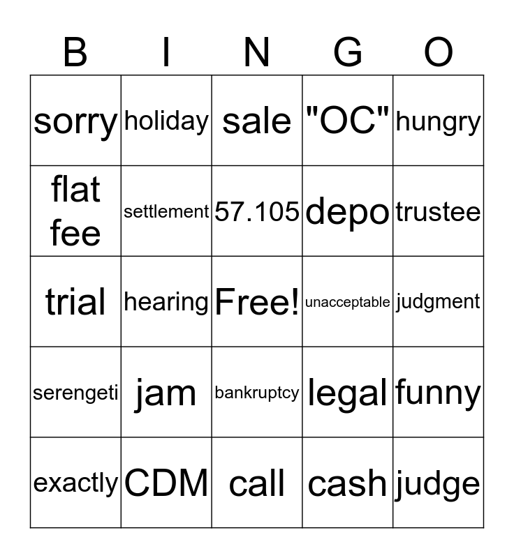 This bingo card has a free space and 24 words: jam, CDM, 57.105, exactly, hungry, sorry, flat fee, holiday, unacceptable, bankruptcy, depo, trial, legal, funny, settlement, cash, judgment, sale, trustee, hearing, judge, serengeti, "OC" and call.