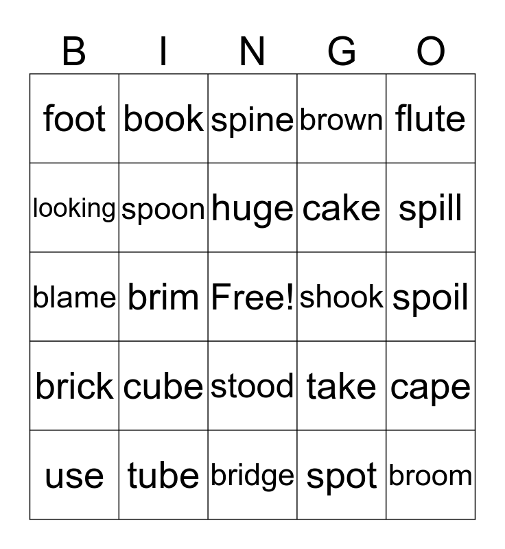 This bingo card has a free space and 24 words: cube, tube, huge, use, flute, foot, looking, book, shook, stood, cake, blame, take, cape, spoon, spot, spoil, spine, spill, brim, broom, brick, brown and bridge.