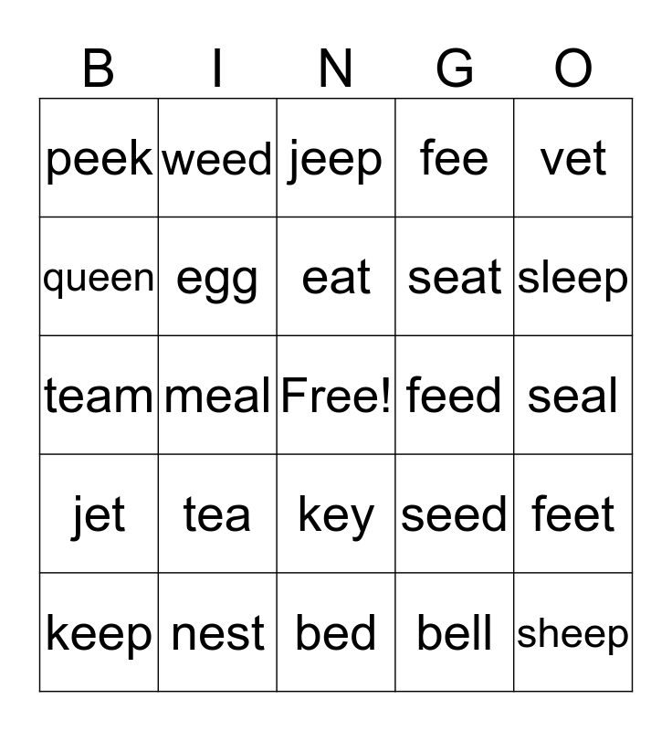 This bingo card has a free space and 25 words: jet, nest, bed, bell, vet, peek, weed, jeep, feed, feet, queen, egg, read, seed, sleep, keep, meal, eat, seat, seal, team, tea, key, fee and sheep.