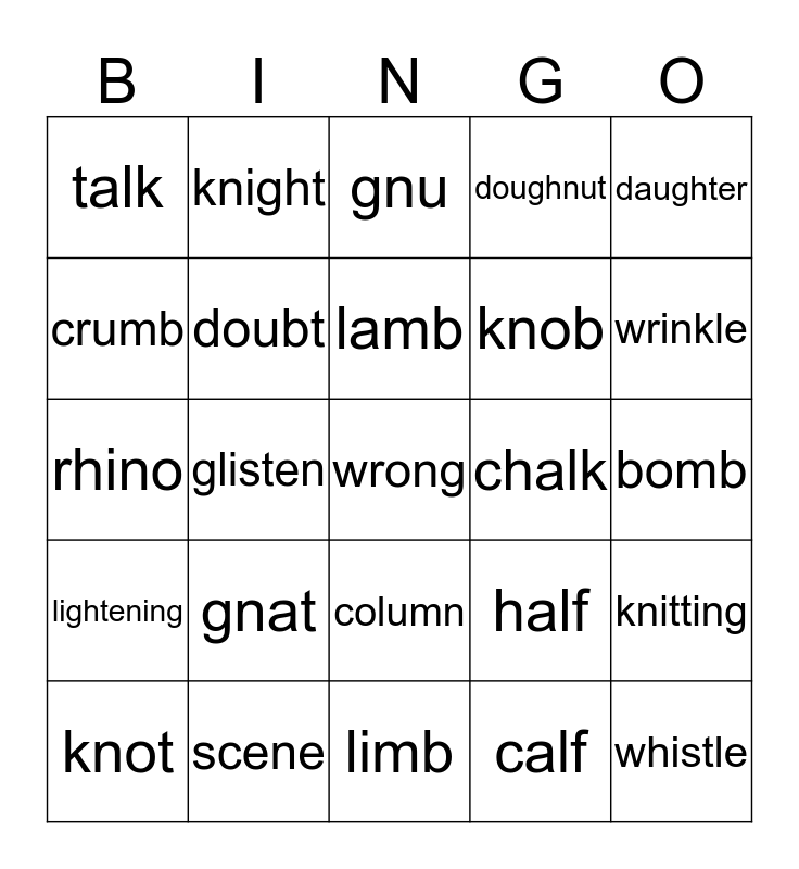 This bingo card has 35 words: written, gnaw, known, doubt, column, doughnut, crumb, science, lamb, listen, rhino, daughter, debt, autumn, talk, chalk, calf, glisten, lightening, wrong, half, knot, knitting, scene, gnu, wrinkle, whistle, frighten, knob, bomb, kneel, limb, gnat, knight and castle.