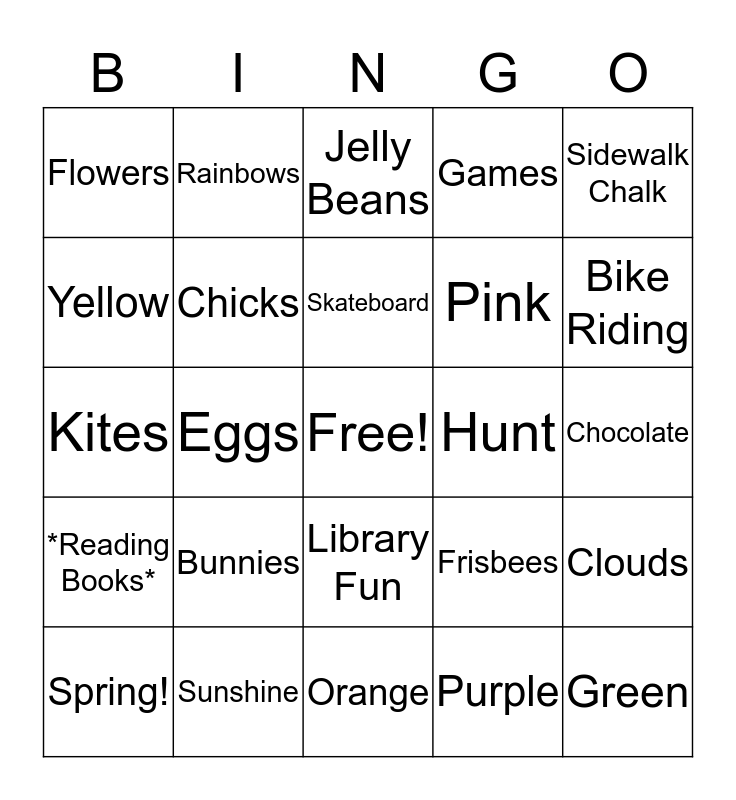 This bingo card has a free space and 29 words: Spring!, Easter, Eggs, Candy, Flowers, Jelly Beans, Chicks, Bunnies, Hunt, Sunshine, Chocolate, Green, Orange, Purple, Bike Riding, April Showers, Library Fun, *Reading Books*, Sidewalk Chalk, Kites, Frisbees, Jump Ropes, Pink, Yellow, Games, Rainbows, Clouds, Skateboard and Roller Blades.
