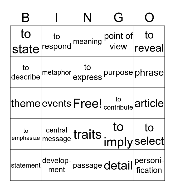 This bingo card has a free space and 24 words: central message, develop- ment, to express, statement, to reveal, to state, to describe, to respond, to contribute, traits, purpose, theme, to imply, to select, metaphor, detail, article, meaning, phrase, events, personi- fication, to emphasize, point of view and passage.
