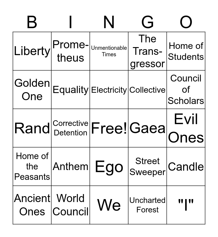 This bingo card has a free space and 24 words: Anthem, World Council, Electricity, Ancient Ones, Home of Students, Liberty, Golden One, Prome-theus, Gaea, Ego, Collective, Rand, Street Sweeper, Candle, Equality, Uncharted Forest, Evil Ones, Unmentionable Times, Council of Scholars, Corrective Detention, "I", Home of the Peasants, The Trans-gressor and We.