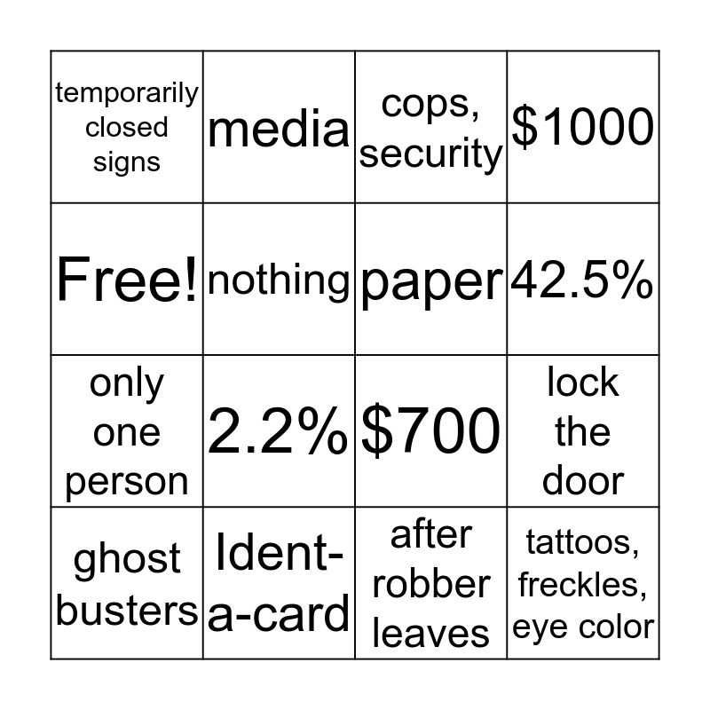 This bingo card has 16 words: Ident-a-card, lock the door, cops, security, temporarily closed signs, only one person, media, $700, after robber leaves, Free!, nothing, ghost busters, $1000, 2.2%, 42.5%, paper and tattoos, freckles, eye color.