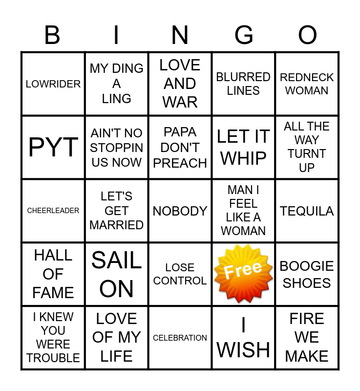 This bingo card has 1 images and 24 words: SAIL ON, CELEBRATION, PAPA DON'T PREACH, I KNEW YOU WERE TROUBLE, REDNECK WOMAN, LOWRIDER, PYT, MY DING A LING, MAN I FEEL LIKE A WOMAN, LOSE CONTROL, LET IT WHIP, CHEERLEADER, BOOGIE SHOES, AIN'T NO STOPPIN US NOW, FIRE WE MAKE, TEQUILA, LOVE AND WAR, ALL THE WAY TURNT UP, LET'S GET MARRIED, NOBODY, LOVE OF MY LIFE, HALL OF FAME, BLURRED LINES and I WISH.