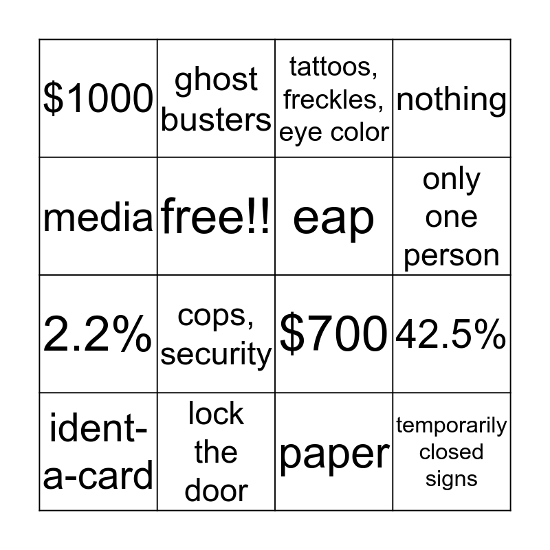 This bingo card has 16 words: lock the door, 42.5%, tattoos, freckles, eye color, $1000, 2.2%, ghost busters, $700, paper, media, free!!, ident-a-card, nothing, cops, security, only one person, eap and temporarily closed signs.