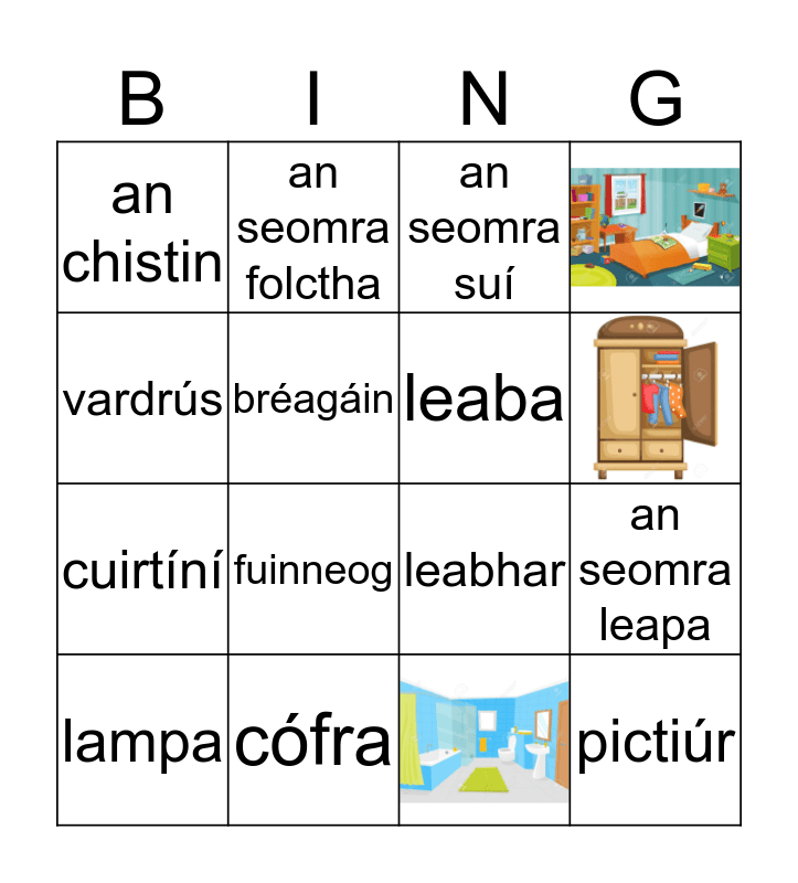 This bingo card has 4 images and 16 words: an seomra leapa, an halla, an seomra suí, éadaí, lampa, vardrús, cófra, an chistin, cuirtíní, an seomra folctha, fuinneog, leabhar, bréagáin, pictiúr, leaba and an seomra bia.