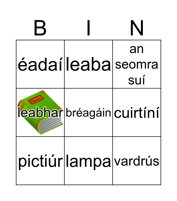 This bingo card has 1 images, a free space and 15 words: an seomra leapa, an halla, an seomra suí, éadaí, lampa, vardrús, cófra, an chistin, cuirtíní, an seomra folctha, fuinneog, leabhar, pictiúr, leaba and an seomra bia.