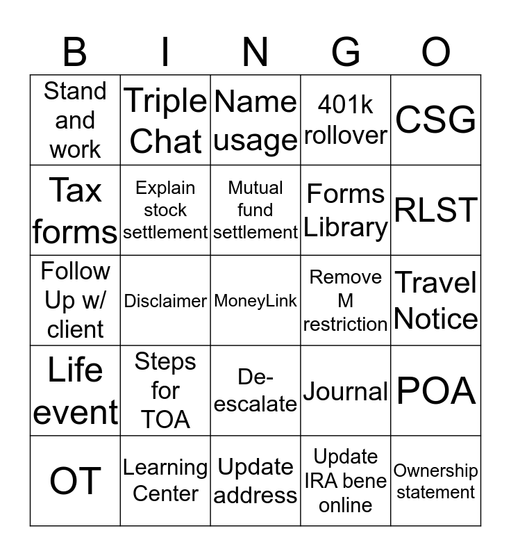 This bingo card has a free space and 44 words: Additional needs check, Steps for TOA, Submit a lead, Update IRA bene online, Cash products interest rates, Margin interest rate, Explain stock settlement, Remove CVRC restriction, 401k rollover, Ownership statement, Stand and work, Learning Center, Journal, Travel Notice, KBA, eDelivery, Update address, Remove M restriction, SendWord, Follow Up w/ client, Triple Chat, De-escalate, 1 chat resolution, CSG, Tax Withholding Elections, Open account, Mutual fund settlement, Enable 3rd party access, POA, OT, IWIN link, Name usage, Complaint, Client Feedback, Life event, Online trade, Use Margin group chat, RGEN Comtrack, RLST, Tax forms, Disclaimer, IPO, Forms Library and Reinvest.