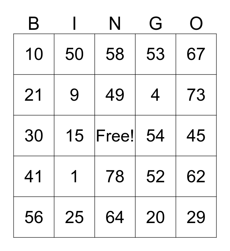This bingo card has a free space and 24 words: 1, 25, 49, 56, 67, 10, 21, 50, 54, 78, 4, 30, 52, 62, 9, 20, 45, 58, 73, 15, 29, 41, 53 and 64.