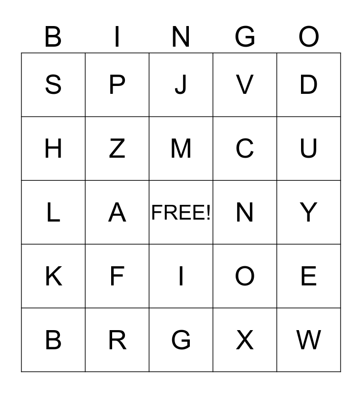 This bingo card has a free space and 24 words: F, R, M, B, D, S, H, P, N, I, C, L, O, E, Z, X, Y, J, U, A, W, K, V and G.