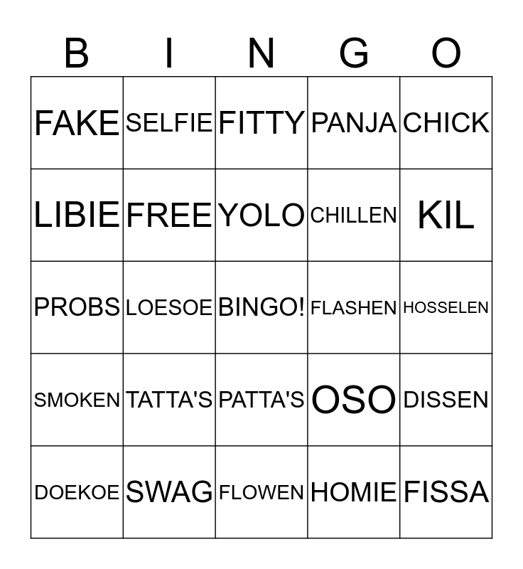 This bingo card has a free space and 24 words: TATTA'S, SWAG, YOLO, DOEKOE, CHICK, FAKE, LIBIE, SELFIE, FLASHEN, PATTA'S, CHILLEN, PROBS, OSO, DISSEN, FREE, HOMIE, HOSSELEN, FITTY, KIL, LOESOE, FISSA, SMOKEN, PANJA and FLOWEN.