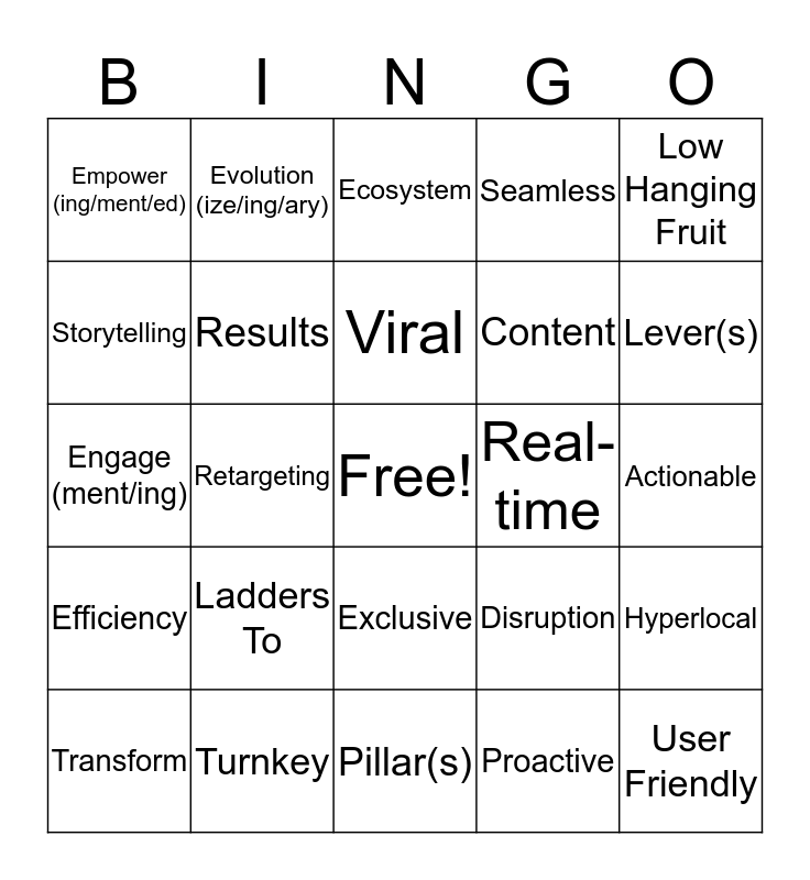 This bingo card has a free space and 44 words: Robust, User Friendly, Unique, Transform, Scalable, Proactive, Ecosystem, Value Proposition, Low Hanging Fruit, Turnkey, Seamless, Real-time, Exclusive, Ladders To, Approach, Pillar(s), Foundation, Engage (ment/ing), Revolution (ize/ing/ary), Lever(s), Evolution (ize/ing/ary), Tap In To, Sustainable, Empower (ing/ment/ed), Leverage, Actionable, Insights, Analytics, Disruption, Efficiency, Gamification, Hyperlocal, KPI, Pain Points, Retargeting, Transparency, Thought Leader, UGC, Viral, Storytelling, Content, Personal (ized/ation), Results and Insights.