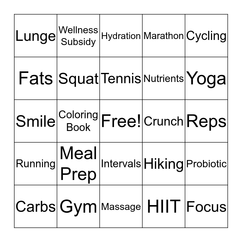 This bingo card has a free space and 83 words: Spa, Electrolytes, Hydration, Picnic, Fitness App, Essential Oils, Crystals, Bath, Soccer, Endurance, Flexibility, Strength, Squat, Crunch, Push Up, Lunge, Carbs, Fats, Fiber, Balance, Vacation, Nutrients, Focus, Giving, Coloring Book, Book, Laugh, Sing, Dance, Volunteer, Meal Prep, Forgiveness, Community, Smile, Family, Cardio, Massage, Water, Yoga, Running, Nutrition, Meditation, Veggies, Protein, Swimming, Sleep, Wellness Subsidy, Steps, Zumba, Free, Hiking, Marathon, Reps, Stretch, Journal, Relax, Golf, Skiing, Gym, Vitamins, Sweat, Towel, Crossfit, Cycling, Breathe, Probiotic, Disconnect, PTO, Fruits, Whole Grains, Omega 3s, Energy, Portions, Intervals, HIIT, Kickboxing, Basketball, Tennis, Weights, Scale, Puzzle, Sudoku and Treadmill.