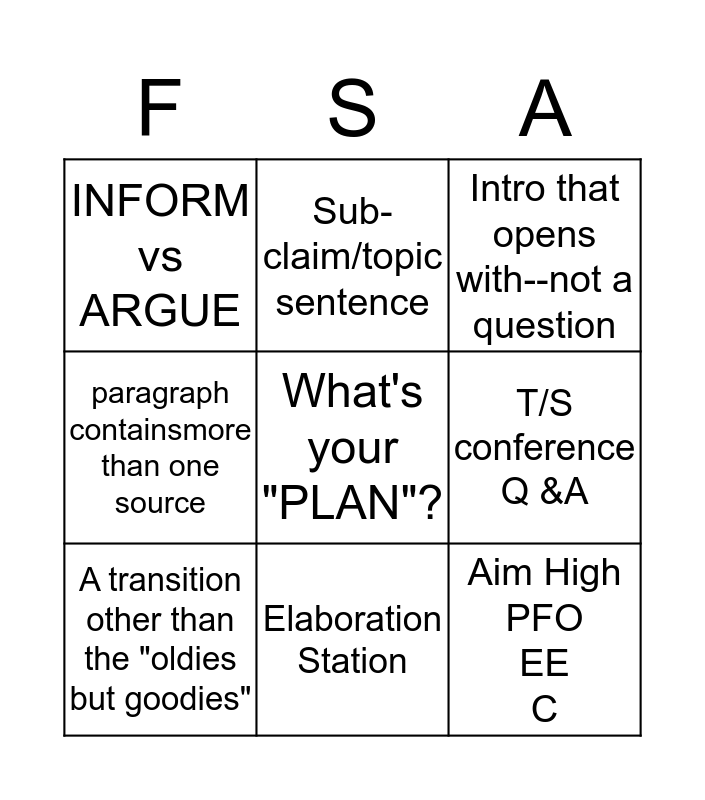 This bingo card has 9 words: A transition other than the "oldies but goodies", Intro that opens with--not a question, Sub-claim/topic sentence, paragraph containsmore than one source, INFORM vs ARGUE, T/S conference Q &A, What's your "PLAN"?, Aim High PFO EE C and Elaboration Station.