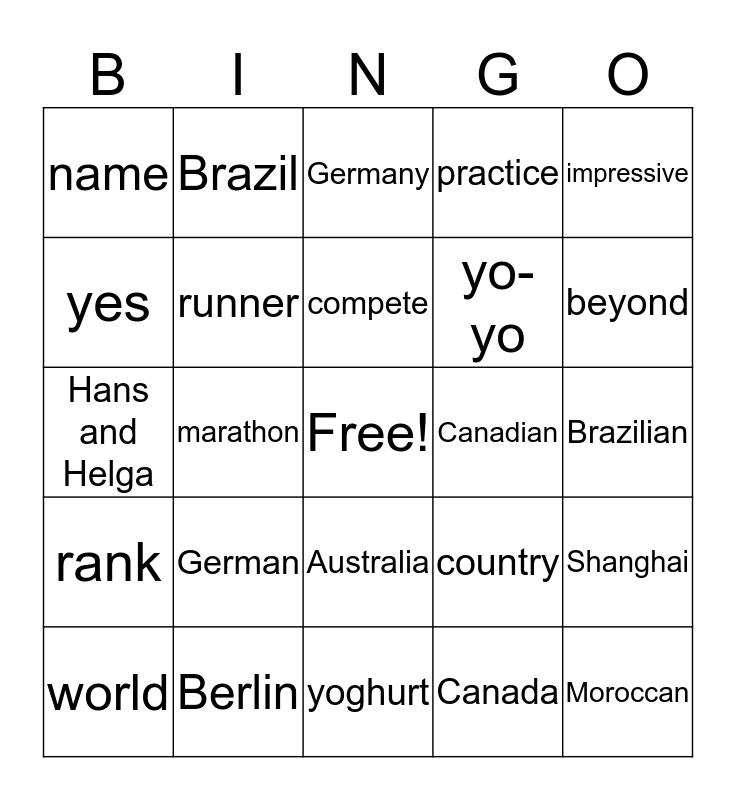 This bingo card has a free space and 39 words: International event, race, mile, runner, world, Australia, compete, European, impressive, rank, marathon, practice, Moroccan, Brazilian, Canadian, German, Chinese, name, New York, country, yes, yoghurt, yo-yo, beyond, William, Australian, live, Sydney, language, Brazil, Sao Paulo, Portuguese, Germany, Berlin, Canada, America, Shanghai, Hans and Helga and Berlin.