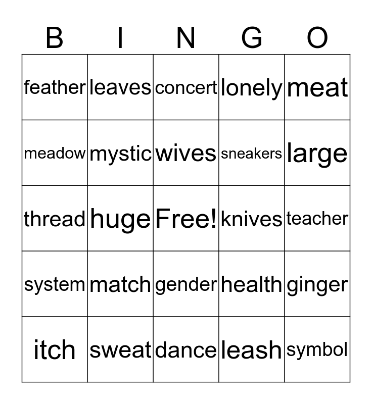 This bingo card has a free space and 24 words: match, sweat, wives, itch, meat, feather, meadow, leaves, knives, gender, sneakers, thread, health, ginger, mystic, leash, teacher, concert, large, huge, symbol, system, lonely and dance.