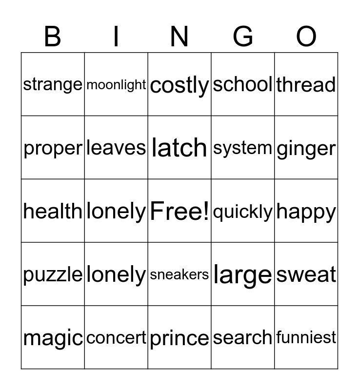 This bingo card has a free space and 24 words: lonely, concert, latch, magic, thread, strange, proper, moonlight, quickly, sneakers, system, health, large, sweat, leaves, search, happy, costly, ginger, lonely, funniest, puzzle, school and prince.