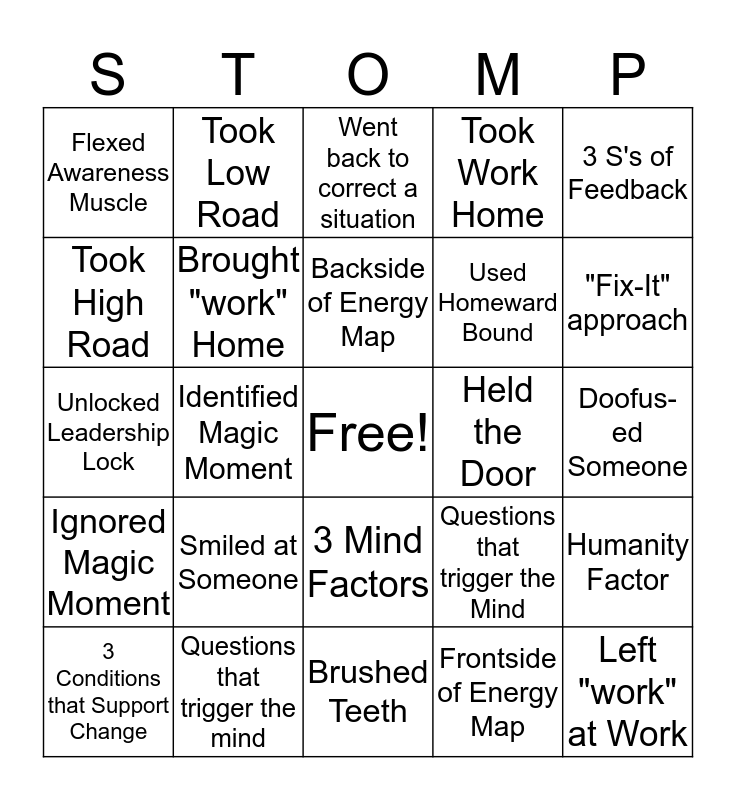 This bingo card has a free space and 26 words: 3 Mind Factors, Frontside of Energy Map, Backside of Energy Map, Questions that trigger the mind, 3 S's of Feedback, Flexed Awareness Muscle, Took High Road, Took Low Road, Doofus-ed Someone, Questions that trigger the Mind, Used Homeward Bound, Unlocked Leadership Lock, Humanity Factor, 3 Conditions that Support Change, Identified Magic Moment, Eliminated Leadership Blind Spot, Took Work Home, Ignored Magic Moment, Went back to correct a situation, Left "work" at Work, "Fix-It" approach, Brushed Teeth, Held the Door, Smiled at Someone, Brought "work" Home and Went out of your way to help.