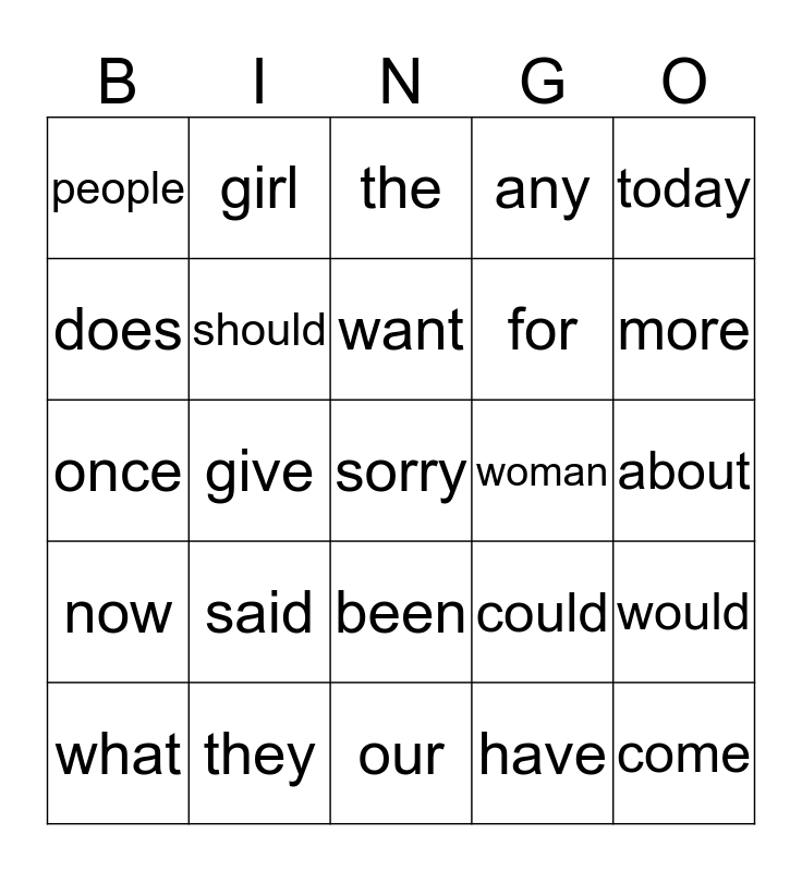 This bingo card has a free space and 24 words: said, they, want, what, today, people, does, girl, woman, been, for, once, could, would, should, have, about, the, more, give, come, now, any and our.