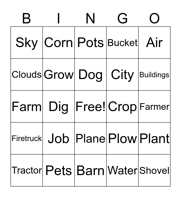 This bingo card has a free space and 25 words: Job, Barn, Dog, Tractor, Air, Sky, Clouds, Corn, Crop, Plane, City, Farm, Plow, Plant, Grow, Tractor, Farmer, Pots, Buildings, Dig, Shovel, Pets, Firetruck, Bucket and Water.