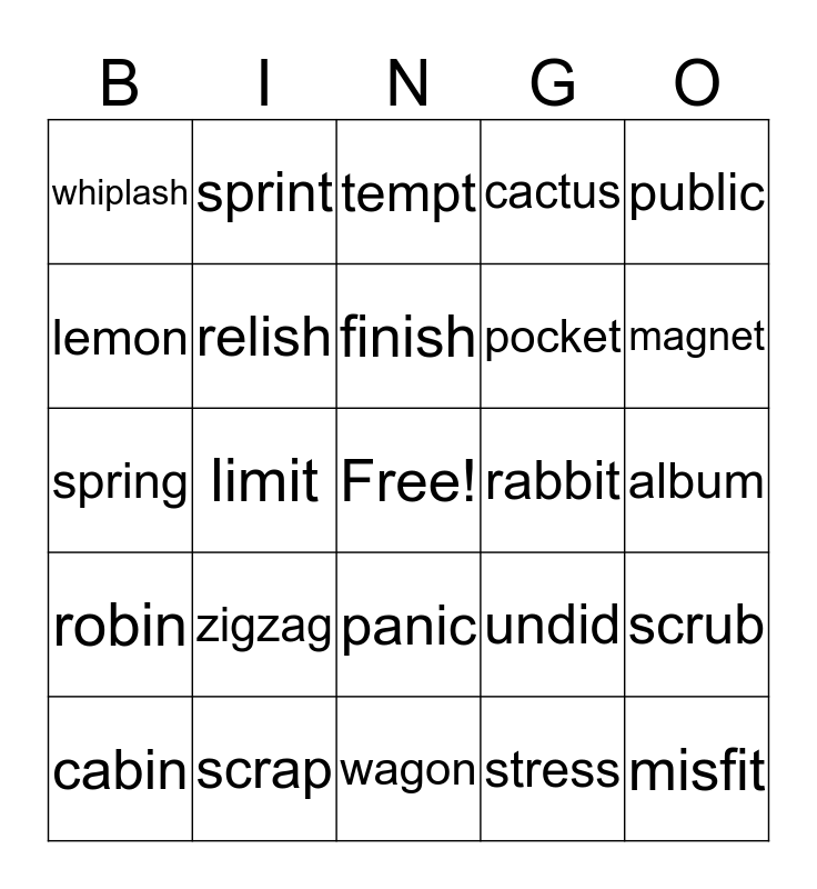 This bingo card has a free space and 39 words: upset, sunlit, pinball, relish, cabin, panic, finish, combat, public, robin, limit, cactus, misfit, album, rabbit, zigzag, habit, whiplash, hatbox, undid, lemon, wagon, pocket, magnet, Falcon, bedbug, pigpen, goblin, napkin, sprint, script, splash, tempt, scrap, stress, strong, scrub, spring and struck.