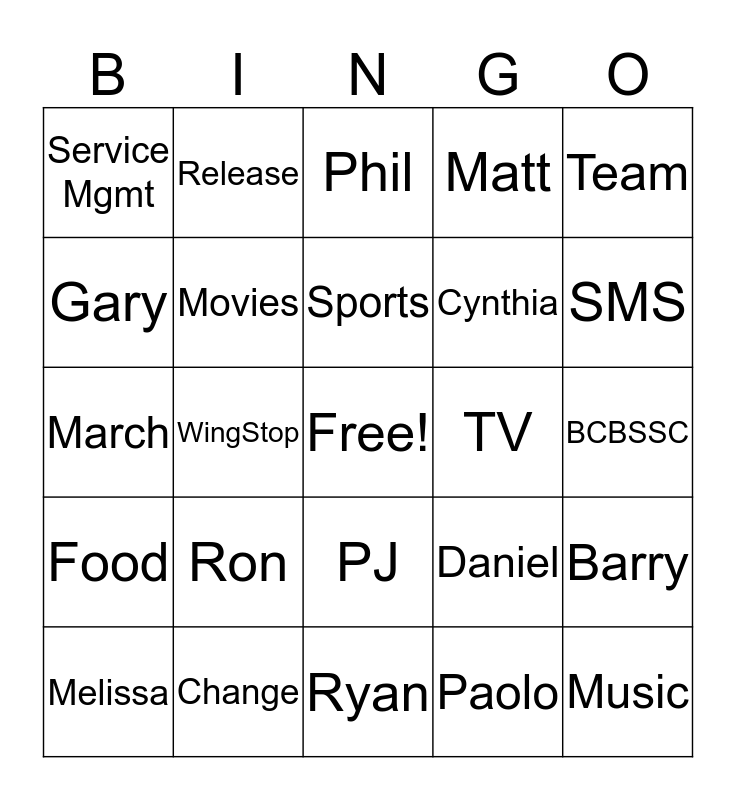 This bingo card has a free space and 24 words: Ron, Change, Sports, Melissa, Team, Service Mgmt, Gary, Release, TV, PJ, Cynthia, March, Daniel, Barry, Movies, Paolo, BCBSSC, Phil, SMS, WingStop, Music, Food, Matt and Ryan.