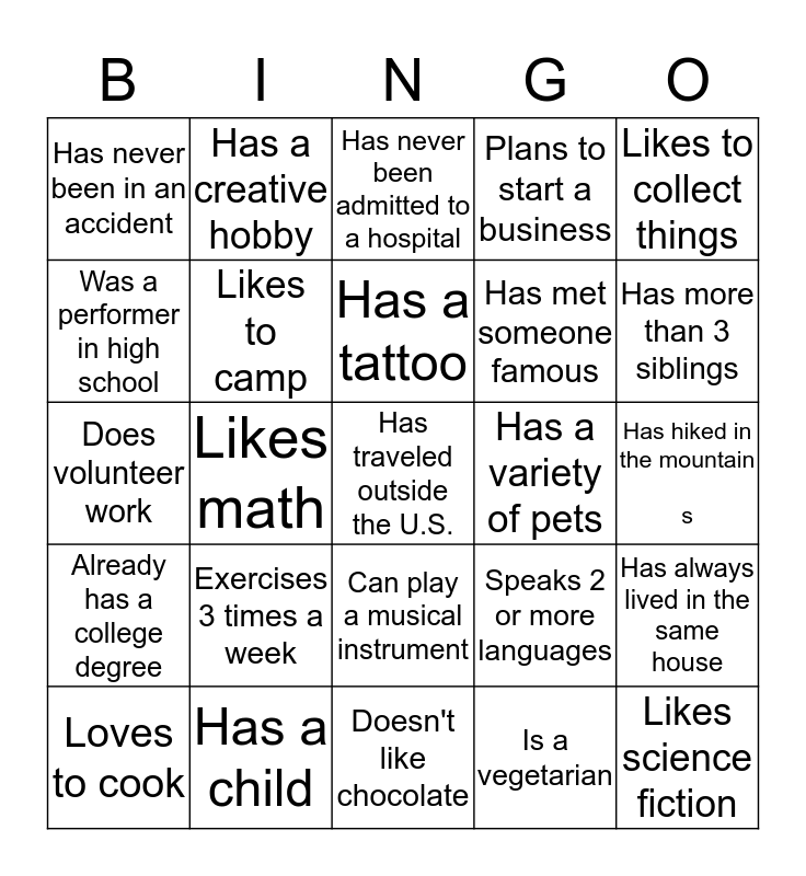 This bingo card has a free space and 24 words: Exercises 3 times a week, Has a child, Has a tattoo, Loves to cook, Likes to collect things, Has never been in an accident, Was a performer in high school, Has a creative hobby, Has a variety of pets, Can play a musical instrument, Has met someone famous, Does volunteer work, Speaks 2 or more languages, Has always lived in the same house, Likes to camp, Is a vegetarian, Has hiked in the mountain s, Has never been admitted to a hospital, Has more than 3 siblings, Likes math, Likes science fiction, Already has a college degree, Plans to start a business and Doesn't like chocolate.