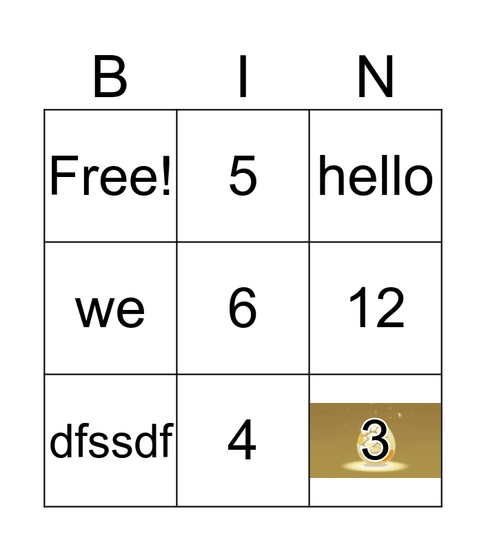 This bingo card has 1 images and 9 words: dfssdf, hello, 5, we, Free!, 12, 6, 3 and 4.