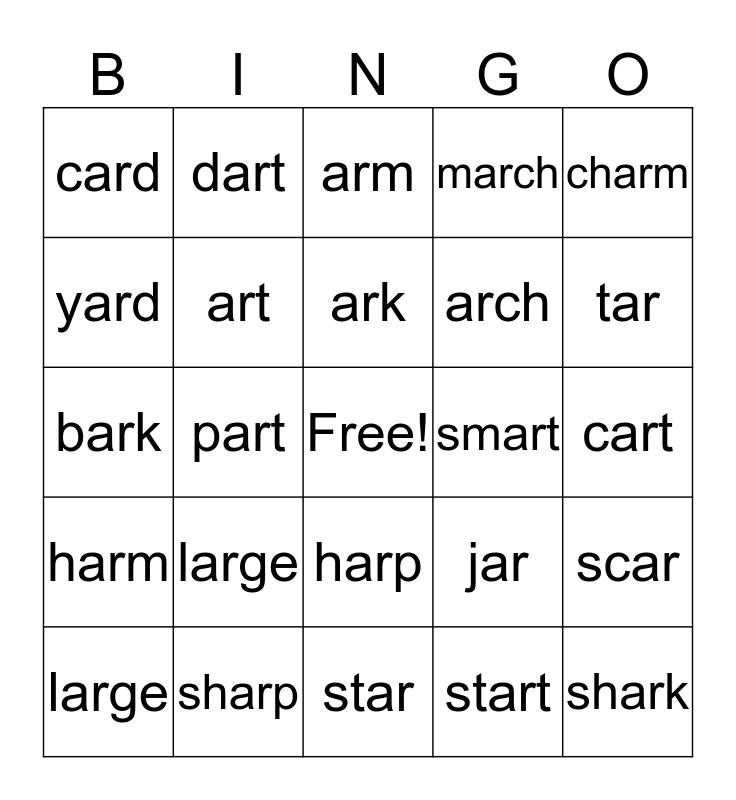 This bingo card has a free space and 29 words: large, barn, part, hard, card, arm, art, large, smart, sharp, cart, shark, star, start, tar, car, harp, harm, charm, bark, jar, bar, arch, yard, march, dart, scar, ark and tart.