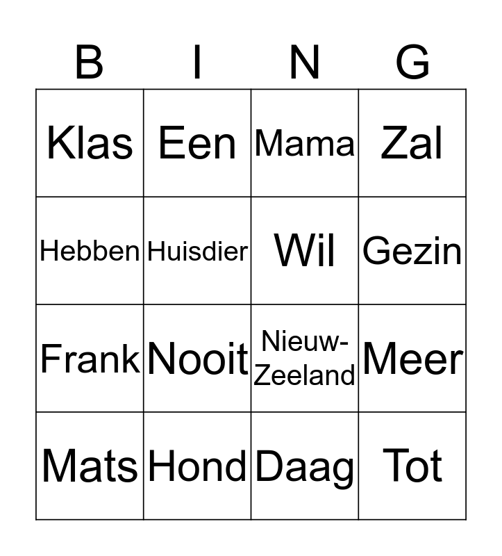 This bingo card has 16 words: Hond, Meer, Mama, Klas, Frank, Een, Nieuw-Zeeland, Daag, Hebben, Huisdier, Mats, Zal, Nooit, Gezin, Wil and Tot.