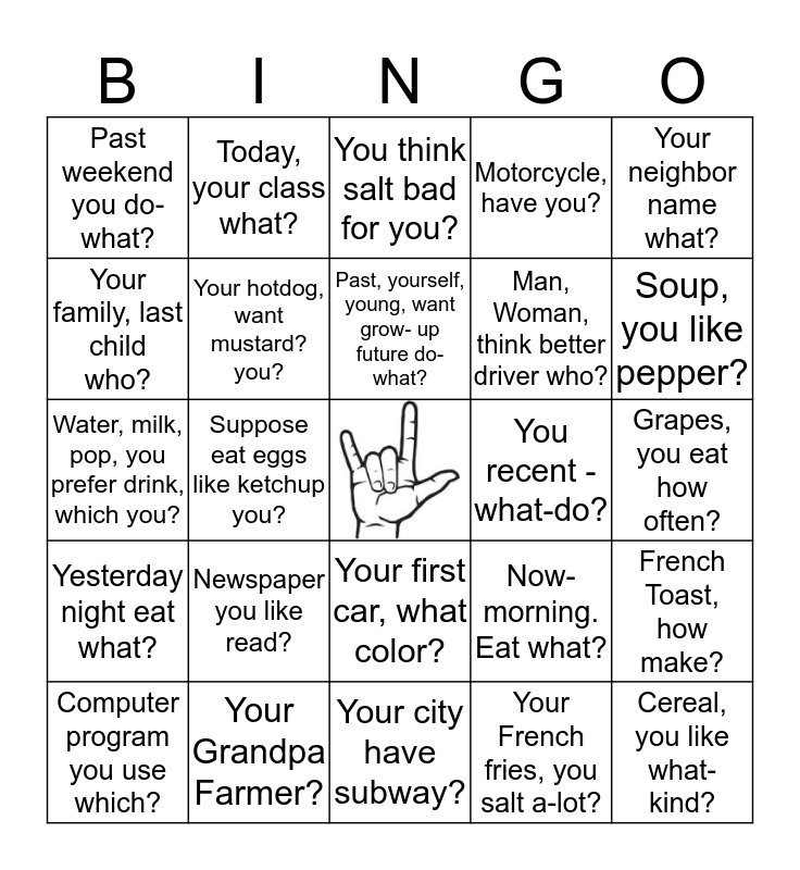 This bingo card has a free space and 24 words: Newspaper you like read?, Your Grandpa Farmer?, Past, yourself, young, want grow- up future do-what?, Computer program you use which?, Your neighbor name what?, Past weekend you do- what?, Your family, last child who?, Today, your class what?, You recent - what-do?, Your first car, what color?, Man, Woman, think better driver who?, Water, milk, pop, you prefer drink, which you?, Now-morning. Eat what?, French Toast, how make?, Your hotdog, want mustard? you?, Your French fries, you salt a-lot?, Grapes, you eat how often?, You think salt bad for you?, Soup, you like pepper?, Suppose eat eggs like ketchup you?, Cereal, you like what-kind?, Yesterday night eat what?, Motorcycle, have you? and Your city have subway?.