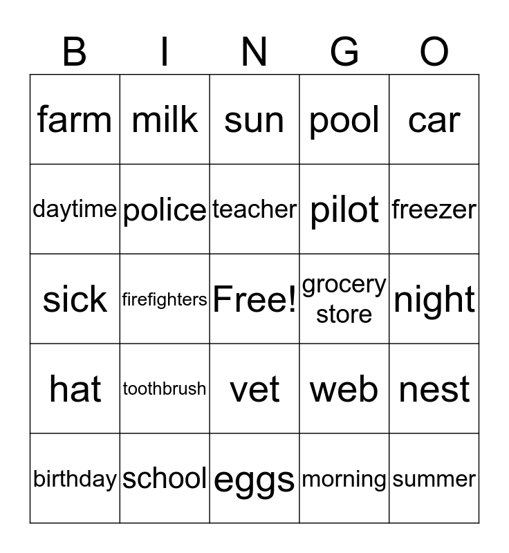 This bingo card has a free space and 24 words: toothbrush, school, teacher, birthday, car, farm, daytime, milk, grocery store, vet, pilot, sick, web, nest, police, morning, night, sun, freezer, firefighters, summer, hat, pool and eggs.