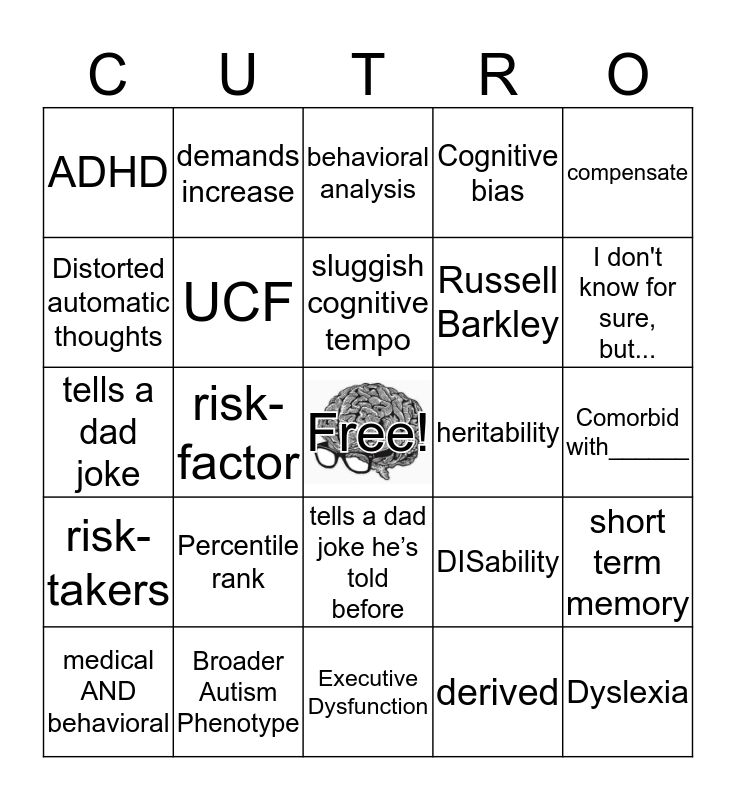This bingo card has a free space and 32 words: derived, accurate, risk-factor, handwriting, risk-takers, UCF, compensate, short term memory, demands increase, up to us as the adults, sluggish cognitive tempo, behavioral analysis, bell curve, family history, heritability, explains something we all already know, medical AND behavioral, tells a dad joke, tells a dad joke he’s told before, Percentile rank, DISability, Executive function, Comorbid with______, Broader Autism Phenotype, Dyslexia, Cognitive bias, Russell Barkley, Distorted automatic thoughts, ADHD, Executive Dysfunction, Differential diagnosis and I don't know for sure, but....