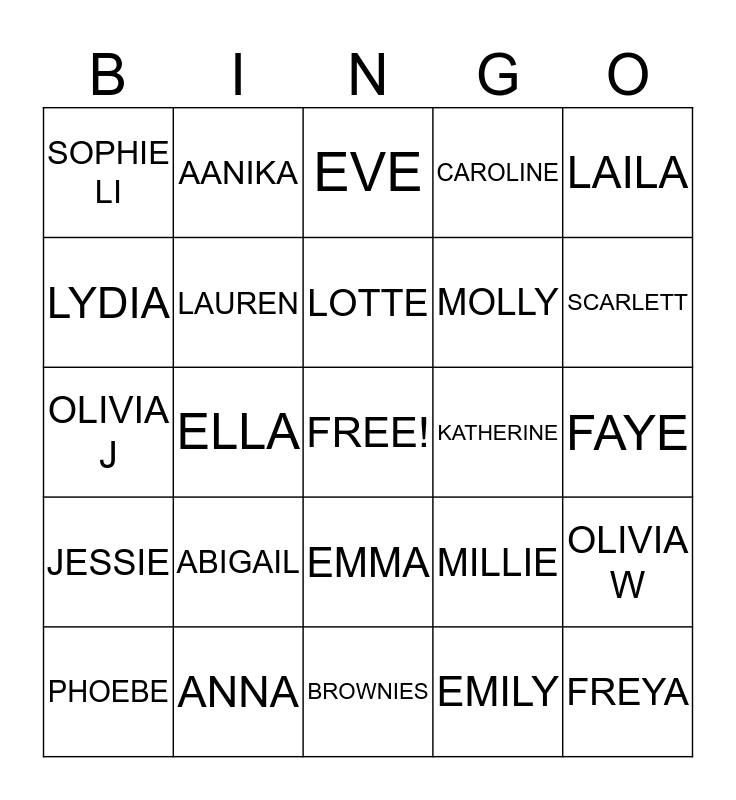 This bingo card has a free space and 24 words: ABIGAIL, ANNA, LOTTE, PHOEBE, LAILA, SOPHIE LI, LYDIA, AANIKA, KATHERINE, EMMA, MOLLY, OLIVIA J, MILLIE, OLIVIA W, LAUREN, EMILY, FAYE, EVE, SCARLETT, ELLA, FREYA, JESSIE, CAROLINE and BROWNIES.