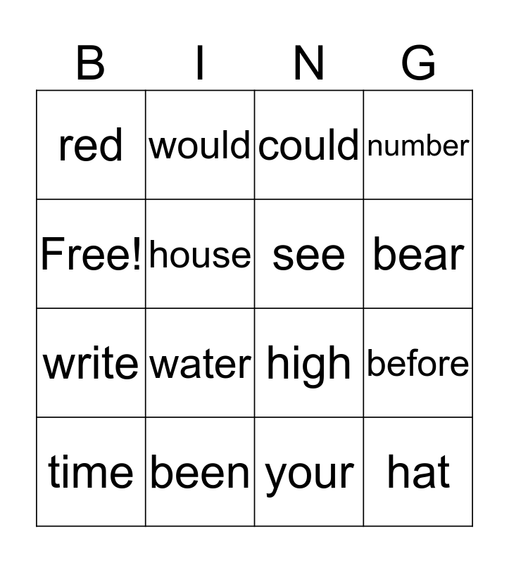 This bingo card has 16 words: been, before, could, red, write, would, high, your, Free!, house, time, number, water, bear, see and hat.
