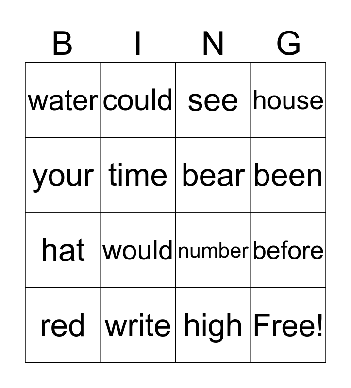 This bingo card has 16 words: write, before, see, water, hat, could, number, high, your, time, red, house, would, been, bear and Free!.