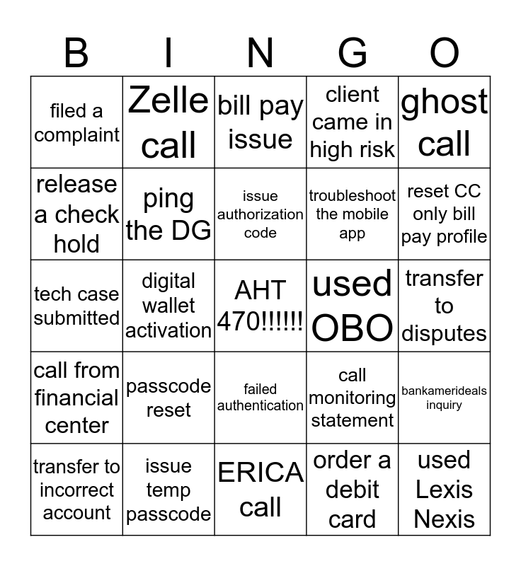 This bingo card has a free space and 24 words: passcode reset, issue temp passcode, issue authorization code, transfer to incorrect account, ghost call, filed a complaint, release a check hold, Zelle call, used OBO, failed authentication, troubleshoot the mobile app, tech case submitted, call monitoring statement, bankamerideals inquiry, ping the DG, order a debit card, transfer to disputes, bill pay issue, reset CC only bill pay profile, digital wallet activation, used Lexis Nexis, call from financial center, client came in high risk and ERICA call.